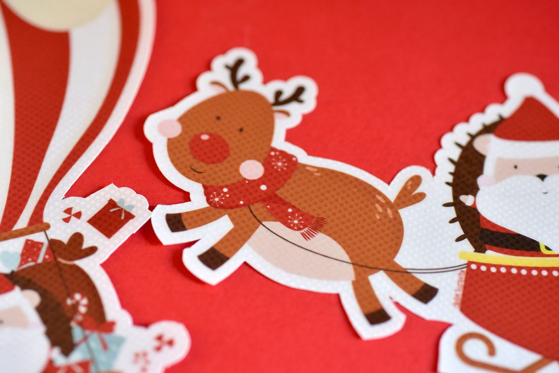 Abbiamo stampato alcuni adesivi riposizionabili proprio in questi giorni per Cinziope, illustratrice che vende articoli di cartoleria illustrati sul suo shop Etsy. In questo caso abbiamo stampato gli adesivi in vinile trasparente con i suoi personaggi natalizi (la renna, Babbo Natale e le casette con gli addobbi).