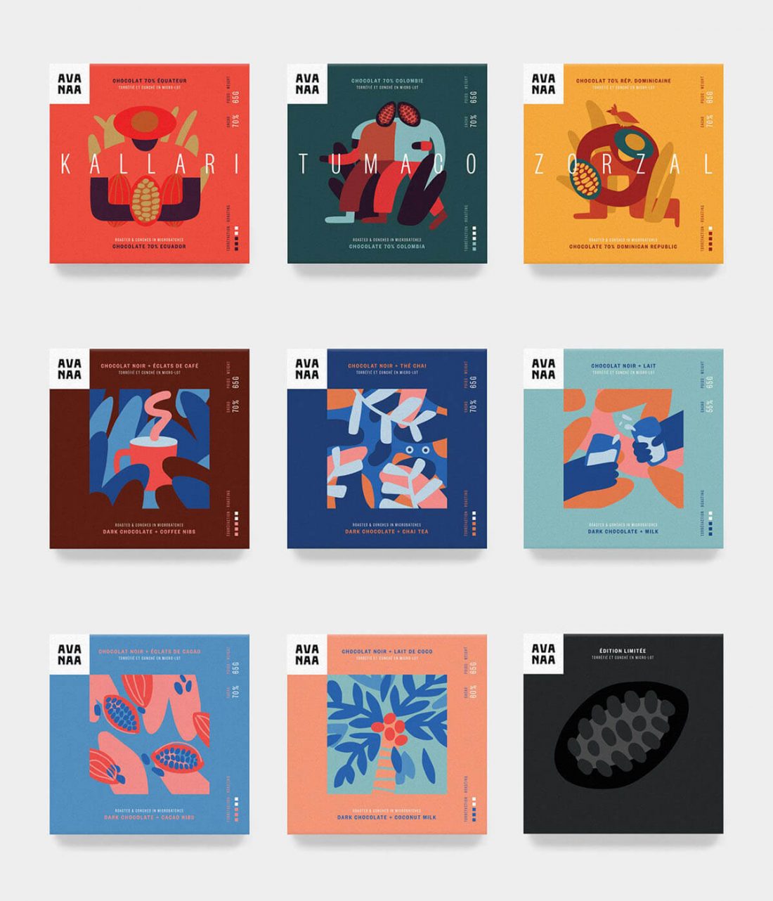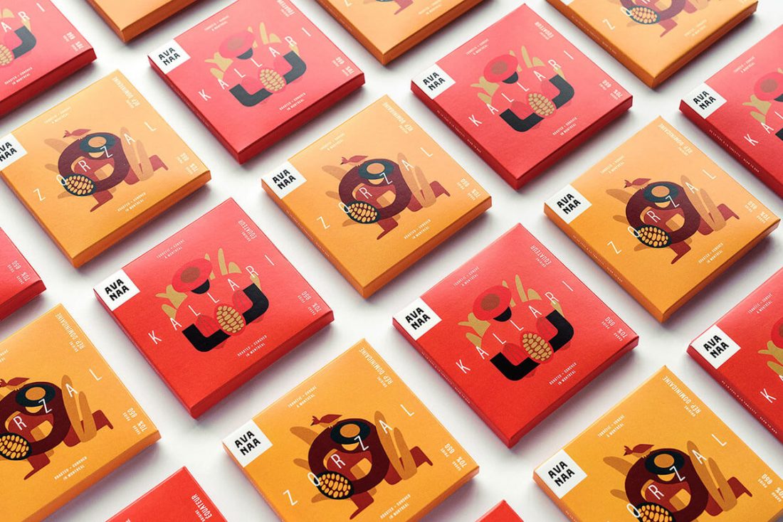 Anche Avanaa è un produttore di cioccolata di tipo bean-to-bar. Controllando ogni fase del processo, dalla fermentazione del cacao al rinvenimento passando per la torrefazione, riesce a fabbricare un prodotto di qualità indiscutibile. Il layout tipografico progettato dallo studio Caserne di Montréal segue una logica intuitiva che consente al consumatore di prendere nota dell’origine, del peso e dell’indicazione di concentrazione del cacao. Le illustrazioni di Cécile Gariépy rendono al tempo stesso omaggio al lavoro nobile e meticoloso dei coltivatori.