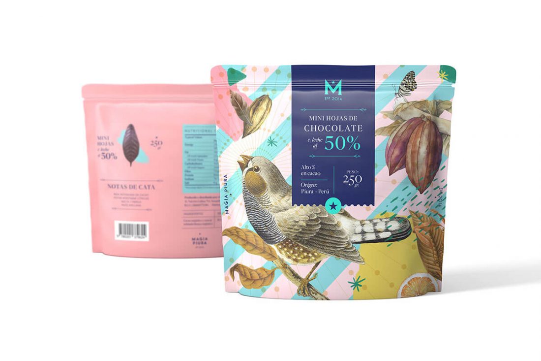 Magia Piura è un marchio specializzato in derivati del cioccolato e cacao e ha sede a Piura, Perù, dove produce e distribuisce i suoi prodotti. Piura è famosa per il suo misticismo e ci sono parti della provincia che mantengono ancora la tradizione e le credenze degli sciamani e degli incantesimi. Per creare la confezione, il graphic design di Lima Alejandro Gavancho è rimasto fedele al concetto di magia: chiave del luogo di origine di questo cacao. Lo ha fatto però mettendolo in relazione con ciò che lo circonda. Cioè collage, trame e colori vivaci ricordano i frutti locali e la natura che cresce rigogliosa vicino alle piantagioni di cacao.