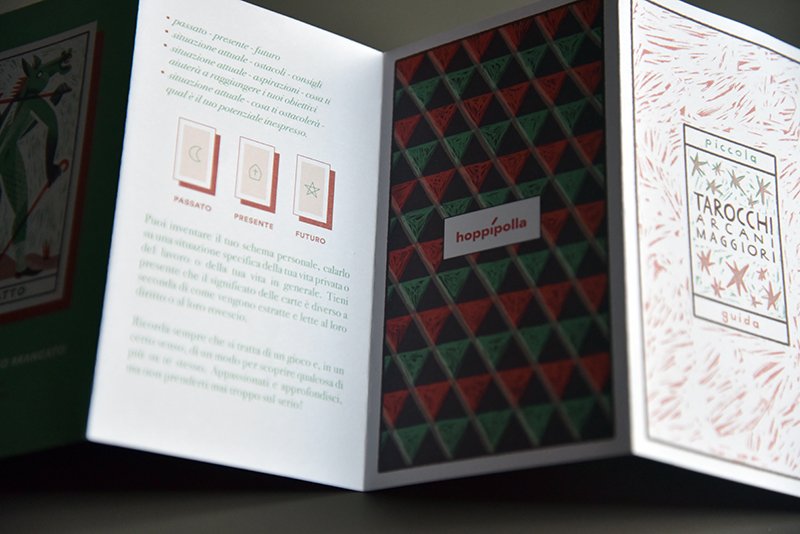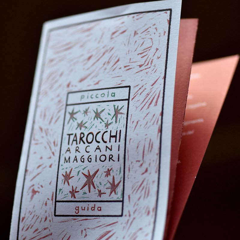 Nella confezione è contenuto anche un pieghevole quattro ante con la descrizione del progetto e una piccola guida all’uso dei Tarocchi. Ha un formato di 8.5×15 cm (chiuso) e 34×15 cm (aperto), stampato (in 4+4) su carta usomano da 120 grammi.