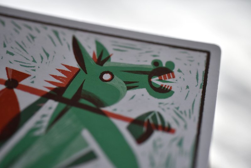 Ho quindi stilato una piccola lista di ipotetici fili rossi, cioè di tematiche che avrebbero costituito il concept dell’intero mazzo e che l’avrebbero reso interessante per qualche motivo. Da questa lista è emersa più delle altre la soluzione della bestia antropomorfa. Se il concept funziona non resta che curare la coerenza formale delle immagini, variabile anche questa più o meno complessa in base al numero di illustrazioni del progetto.