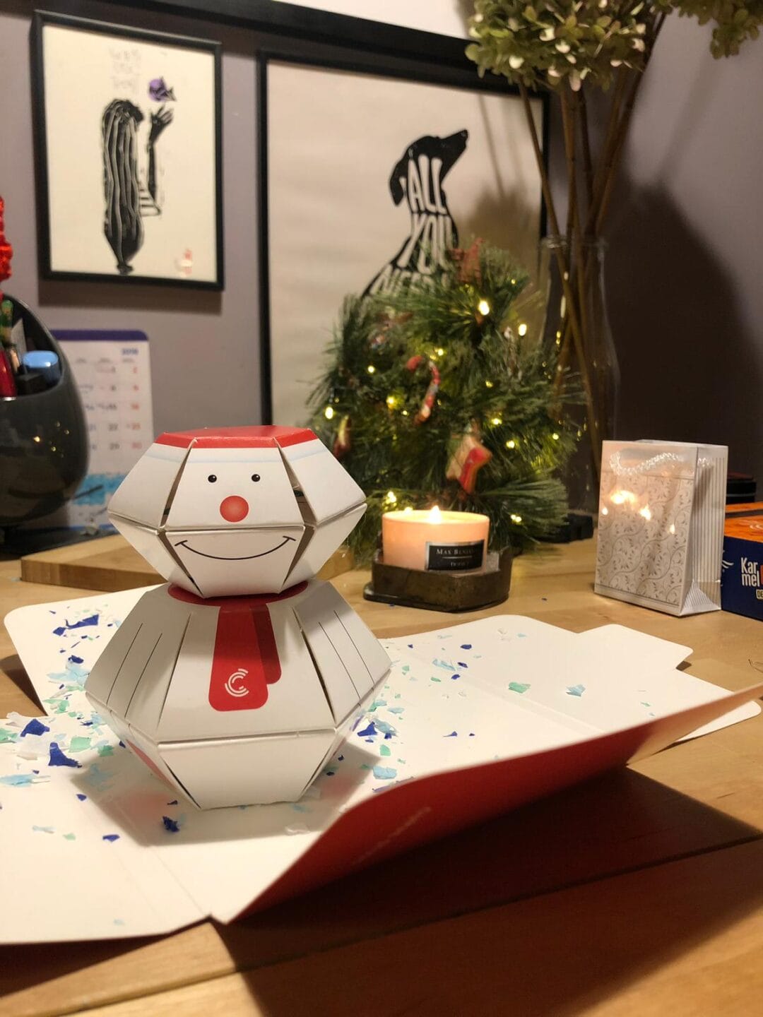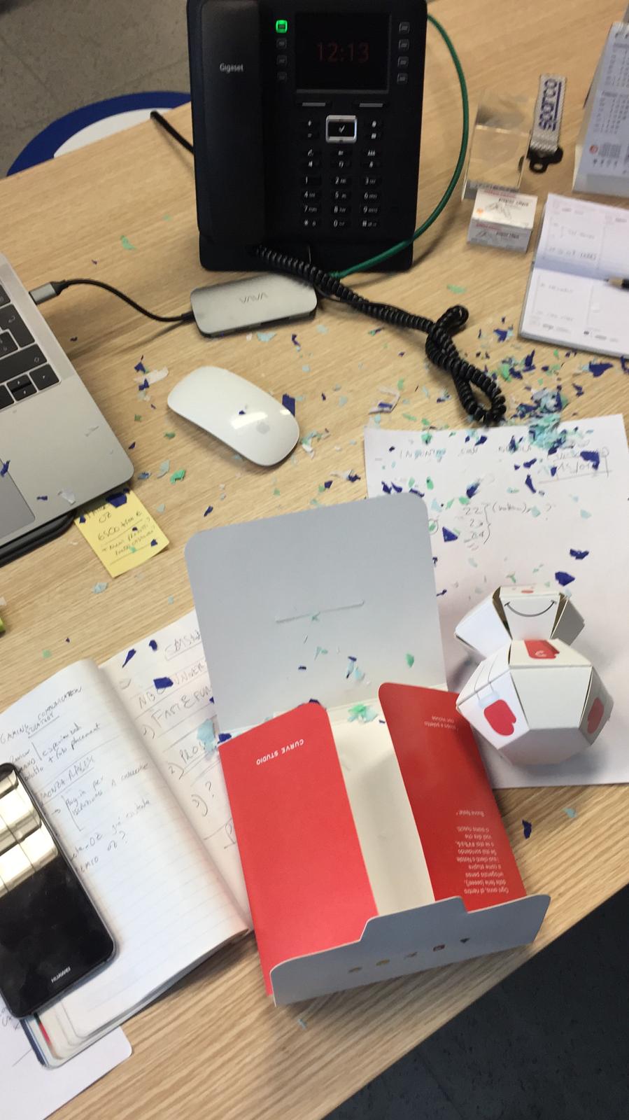 Per rendere l’effetto ancora più sorprendente, sono stati inseriti all’interno della busta dei coriandoli, che, insieme al biglietto/pupazzo, “esplodono” tra le mani del destinatario.