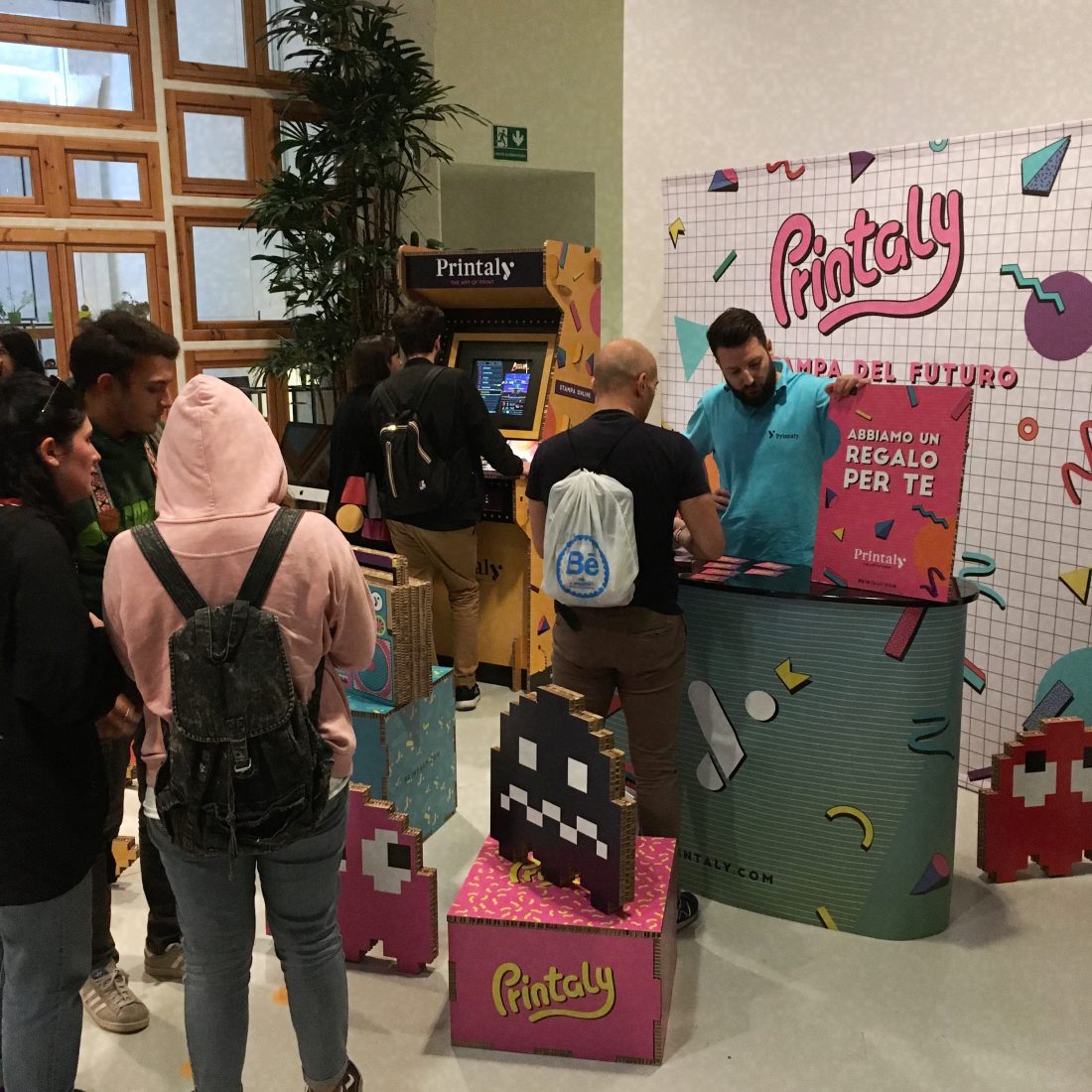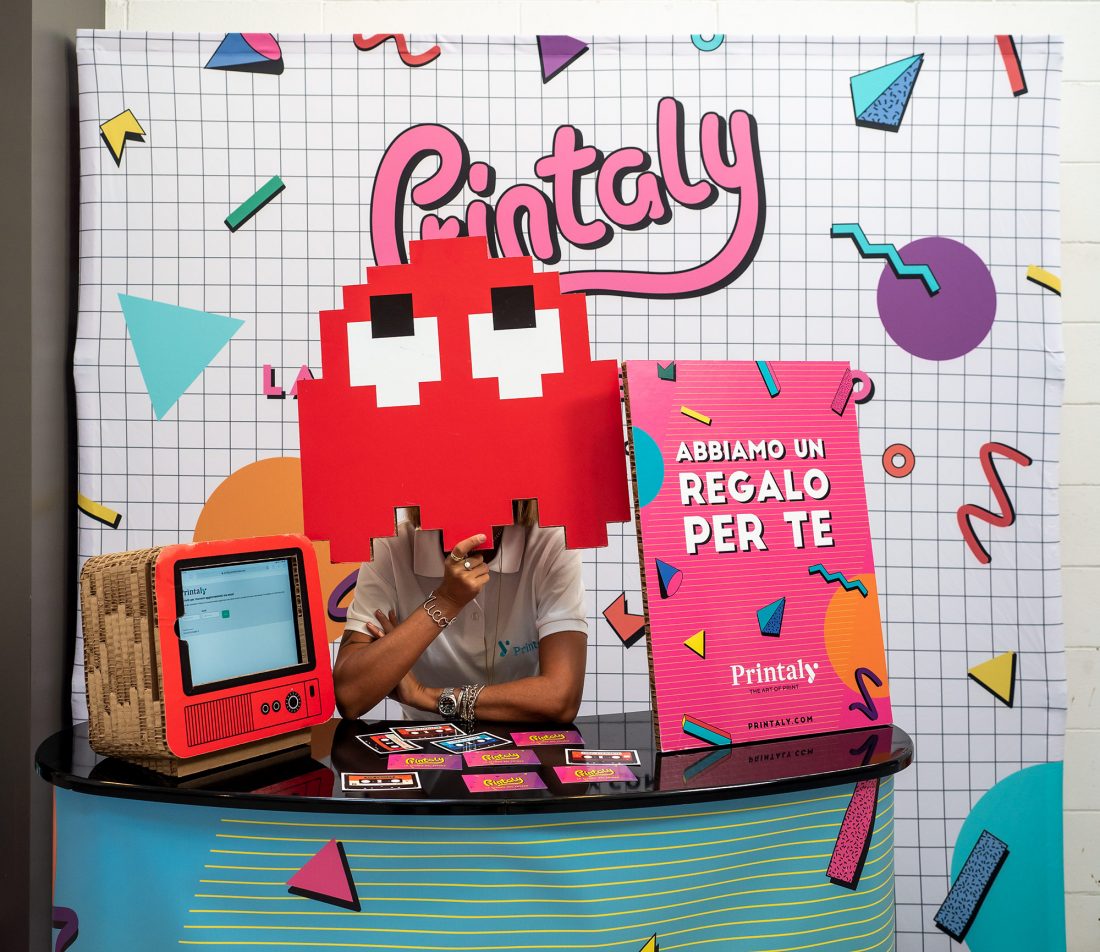 Per far compagnia al videogioco non potevano mancare altri elementi rappresentativi dell’epoca. Abbiamo quindi inserito i Pacman in cartone, dei cubi informativi e funzionali per l’arredamento dello stand e i classici pallini gialli, cibo preferito da Pacman. Questi ultimi li abbiamo stampati come attacca e stacca e plastificazione calpestabile.