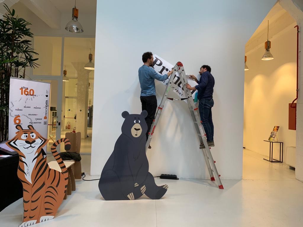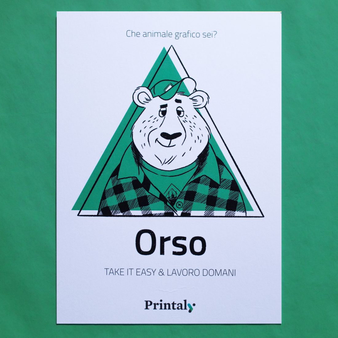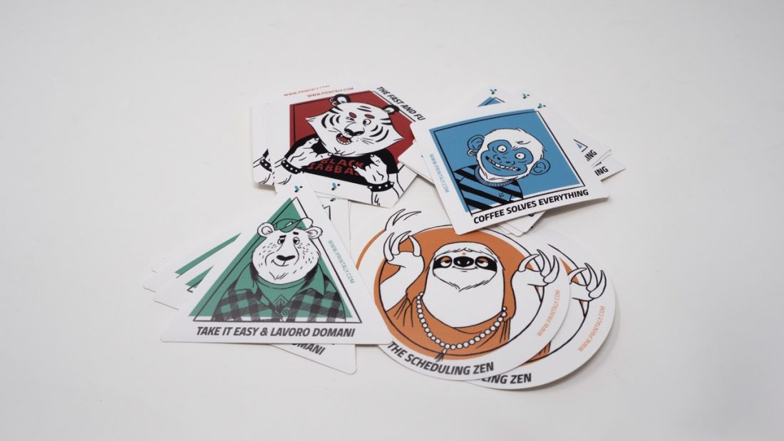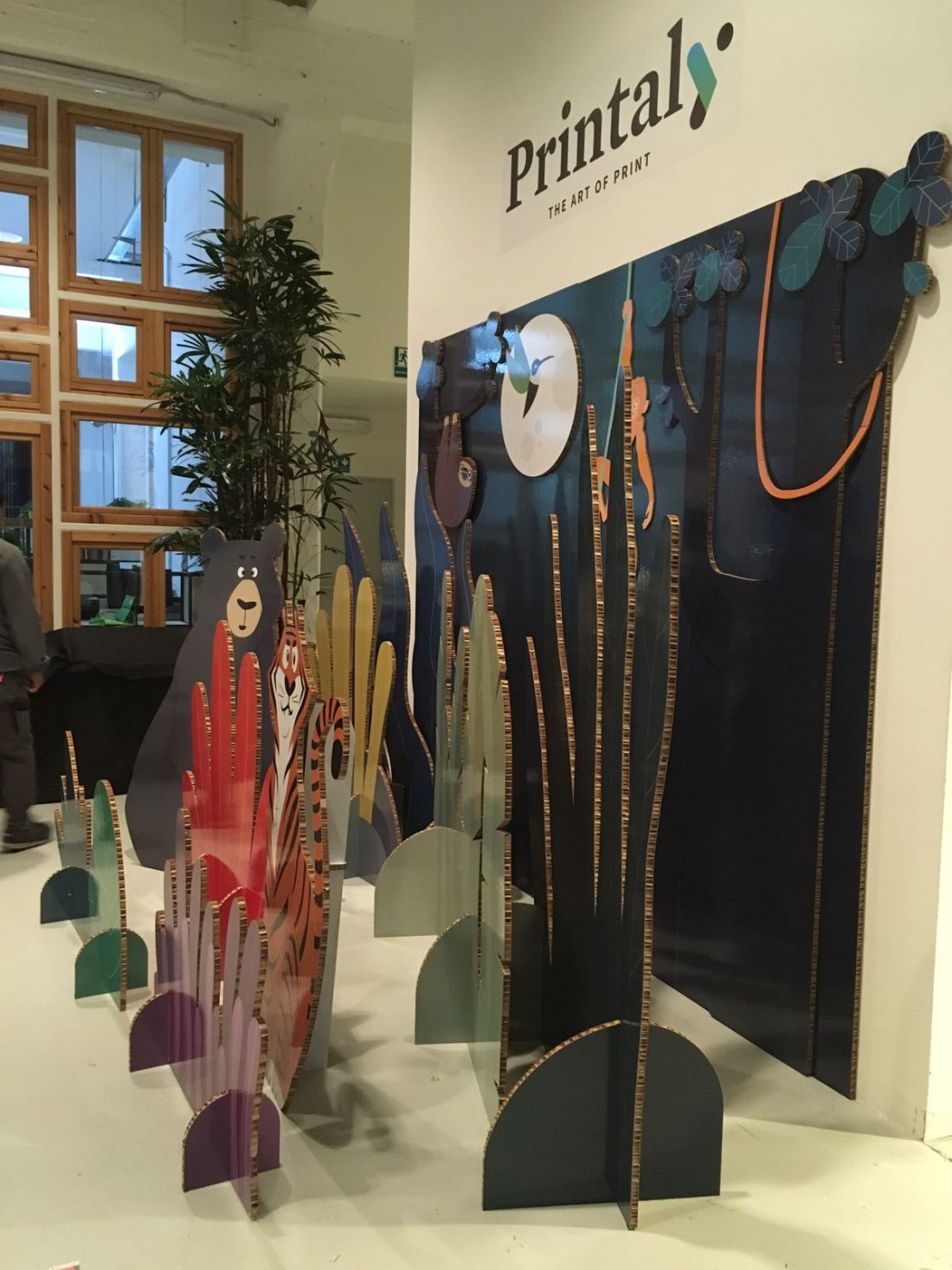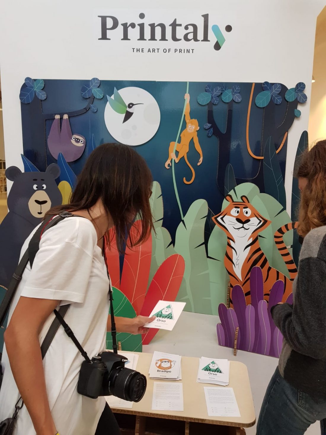 Questo il concept dello stand di Printaly al Torino Graphic Days di quest’anno. Quattro i personaggi che si districano tra la folta vegetazione della giungla del lavoro grafico. Un orso, pigro e ritardatario, una scimmia, indecisa e alle prese con la sua ansia cronica, una tigre, aggressiva e sempre pronta ad afferrare il lavoro come una preda, un bradipo, che con la sua calma serafica organizza i suoi progetti in modo sistematico e fin troppo inquadrato.