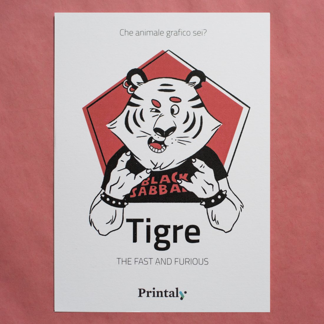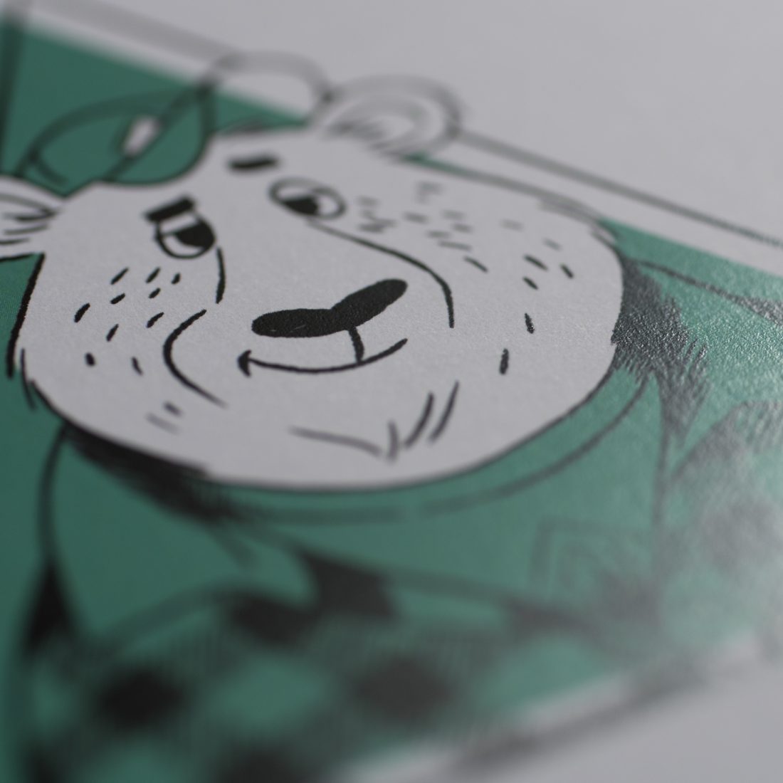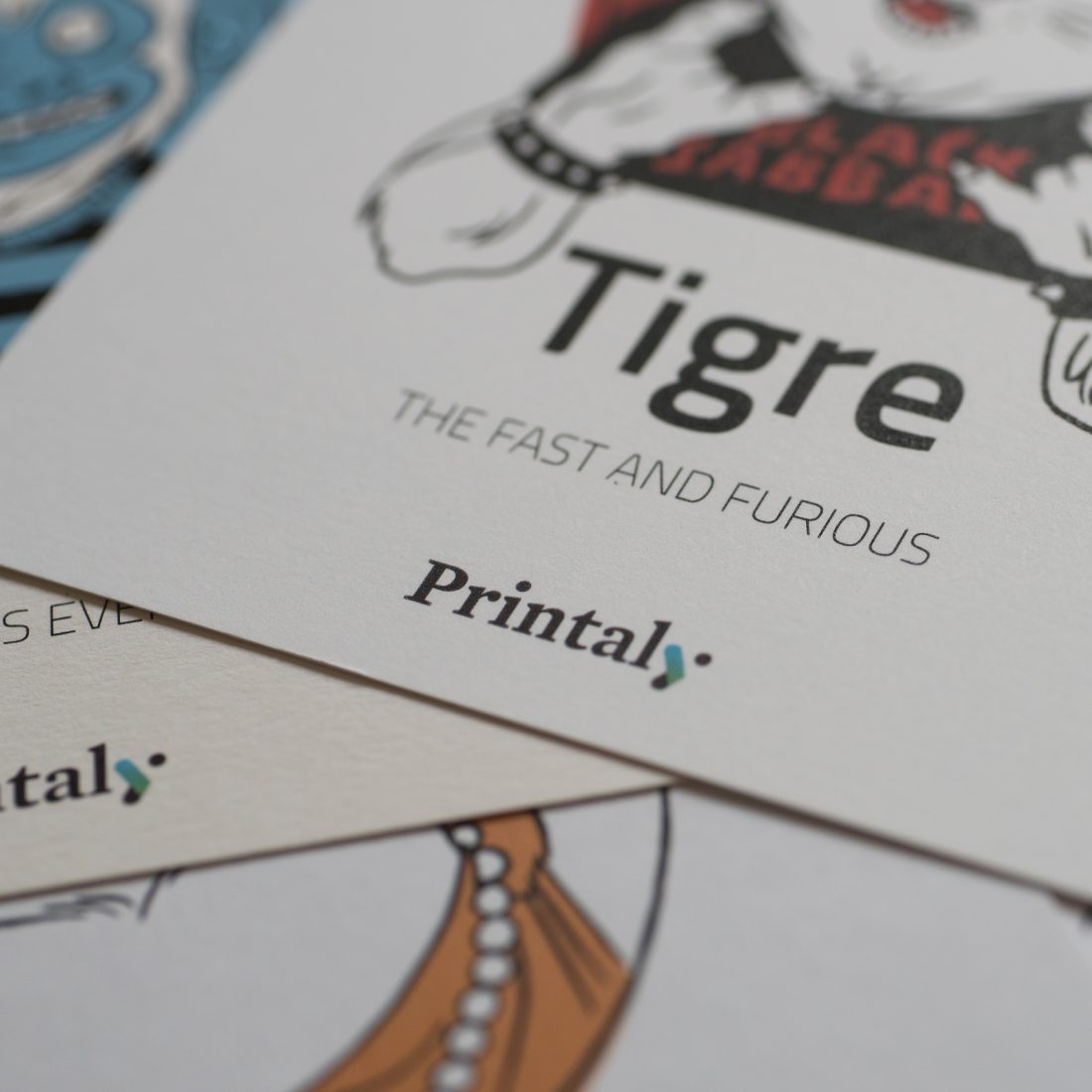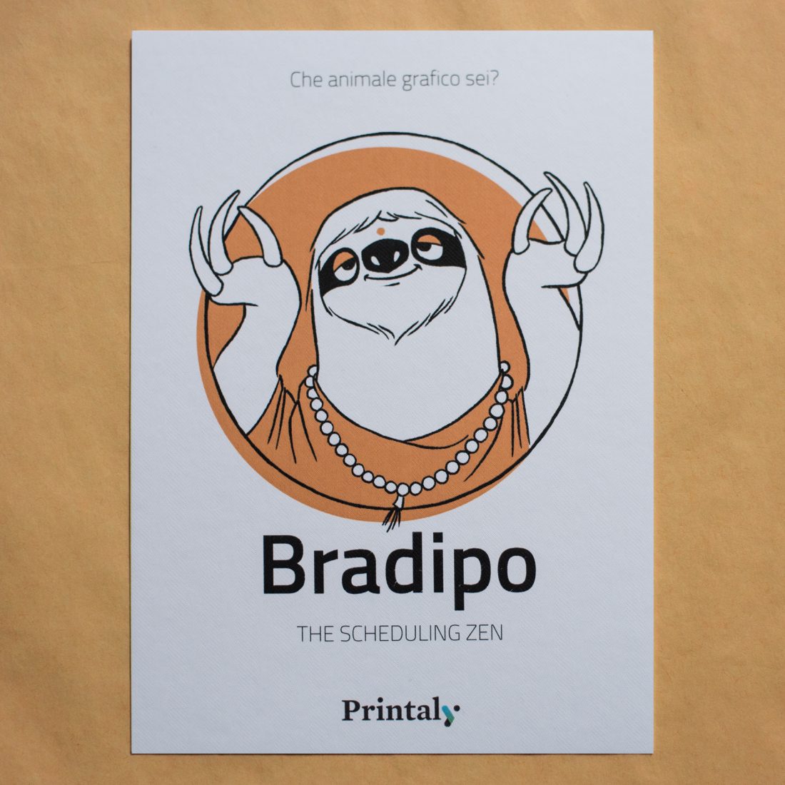 Abbiamo poi stampato quattro cartoline per ognuno degli animali su quattro carte differenti. La cartolina della tigre è stampata su carta Arjowiggins Curious Matter Goya White da 270 grammi, quella della scimmia su carta Arjowiggins Keaykolour Snow White da 300 grammi, mentre la cartolina dell’orso e quella del bradipo rispettivamente su carta Fedrigoni Ispira Bianco da 360 grammi e carta Fedrigoni Savile Row Tweed Extra White da 300 grammi.