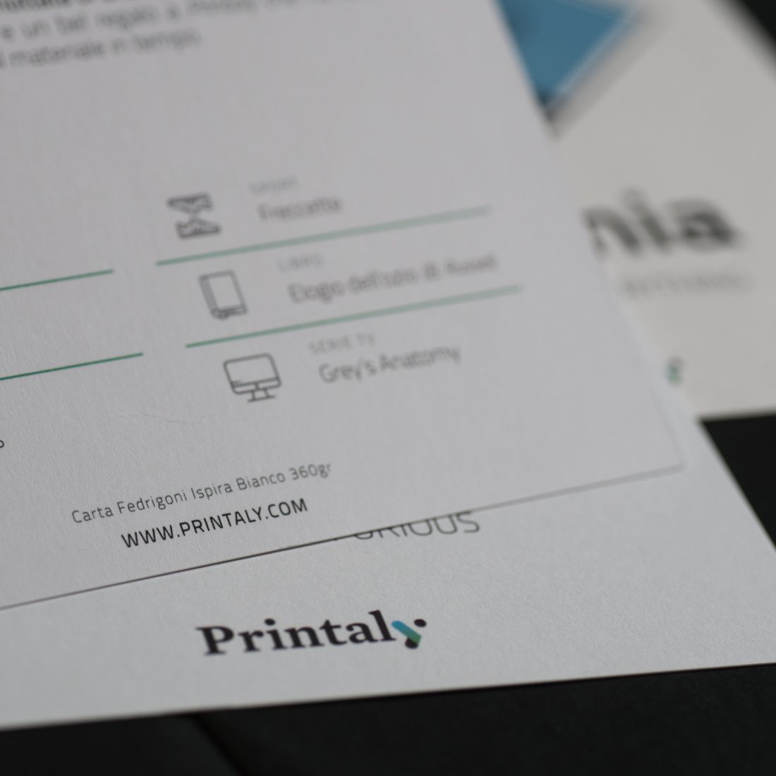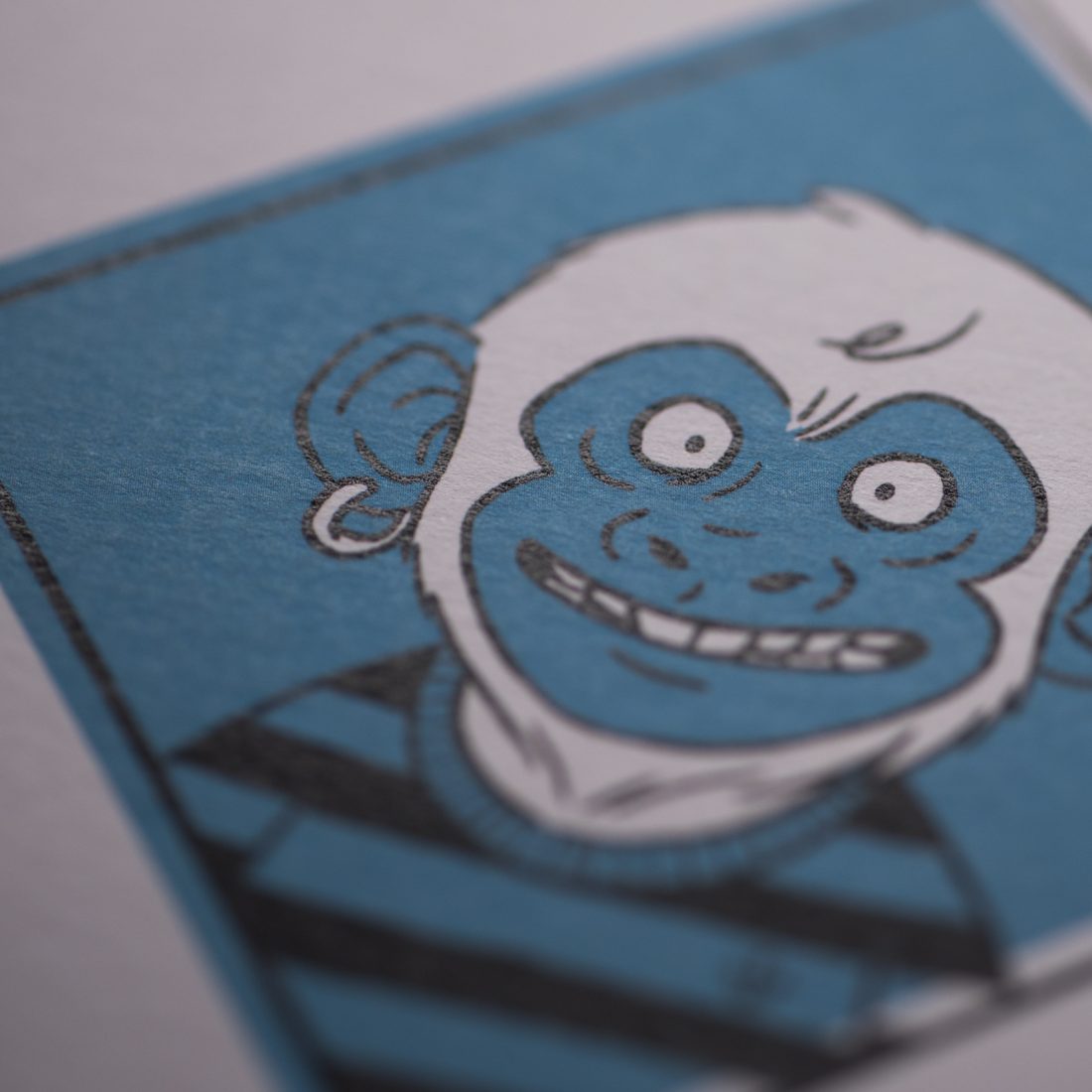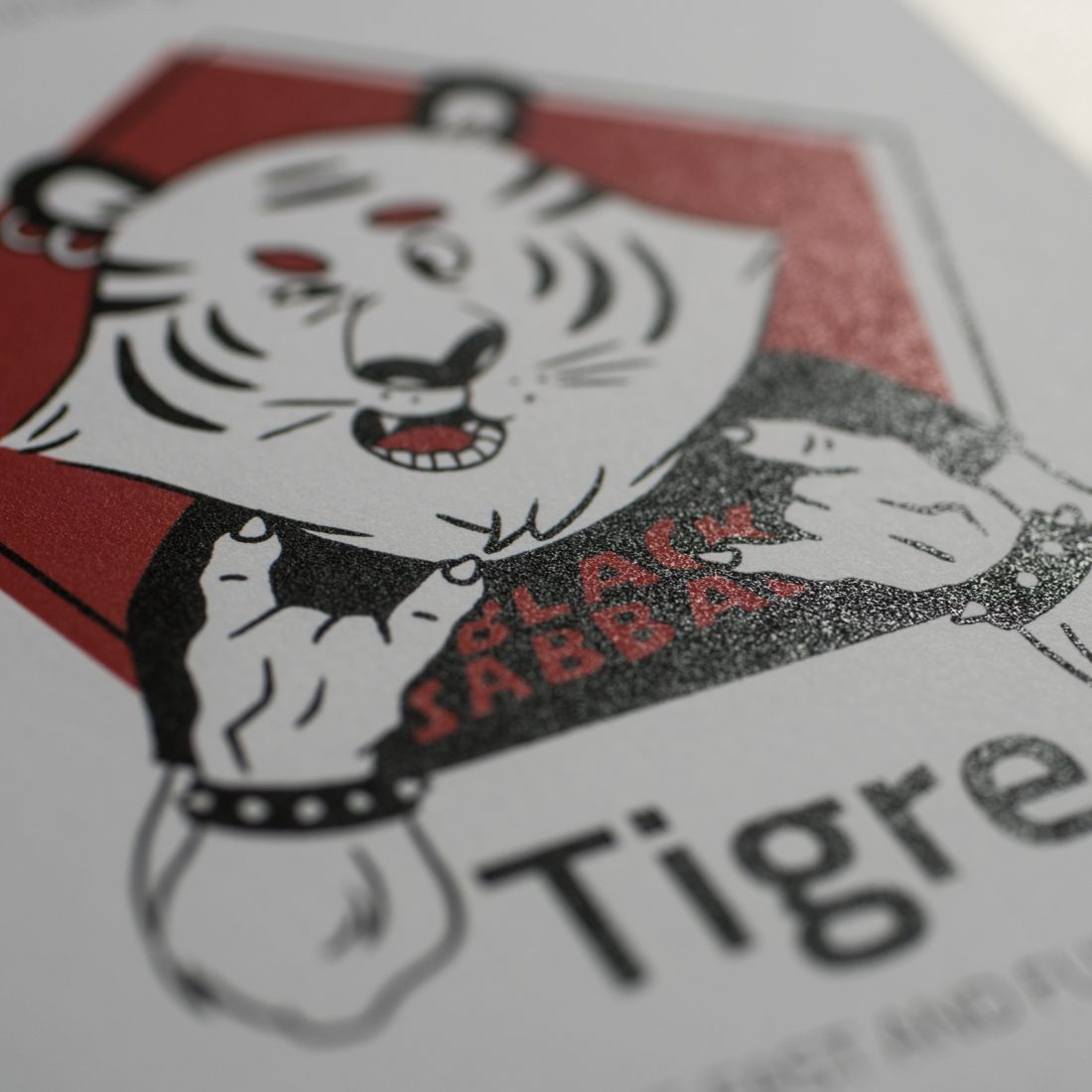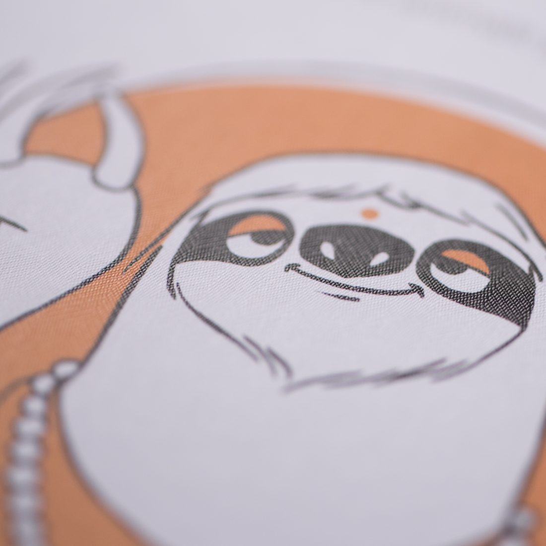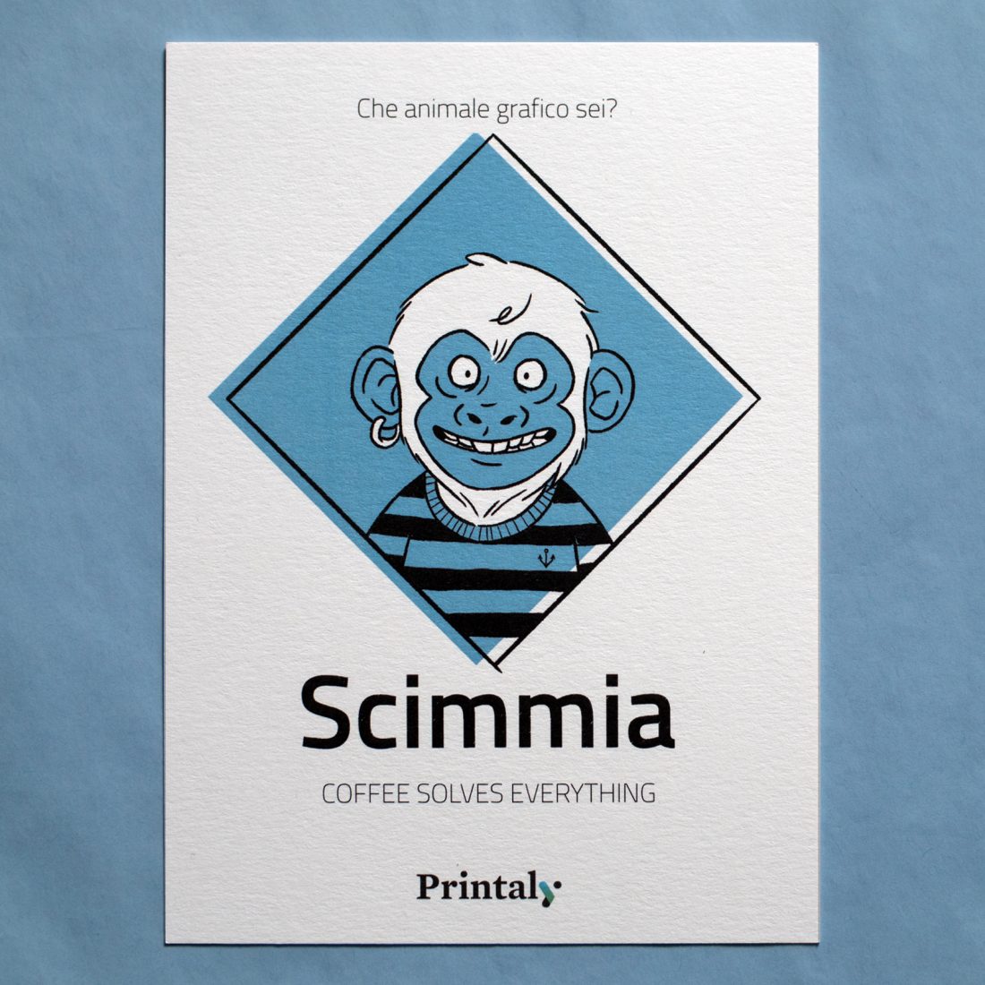 Abbiamo poi stampato quattro cartoline per ognuno degli animali su quattro carte differenti. La cartolina della tigre è stampata su carta Arjowiggins Curious Matter Goya White da 270 grammi, quella della scimmia su carta Arjowiggins Keaykolour Snow White da 300 grammi, mentre la cartolina dell’orso e quella del bradipo rispettivamente su carta Fedrigoni Ispira Bianco da 360 grammi e carta Fedrigoni Savile Row Tweed Extra White da 300 grammi.
