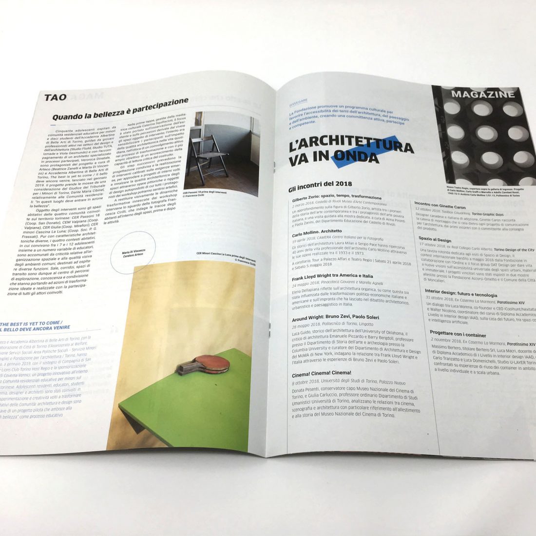 Tao Magazine è il giornale formato tabloid che la Fondazione per l’Architettura Torino pubblica ogni anno per illustrare, attraverso interviste e articoli, le attività svolte e le tematiche affrontate dalla Fondazione stessa. Una volta l’anno infatti la Fondazione si presenta alla città per raccontare a cittadini, architetti, imprese e partner culturali il lavoro portato avanti durante l’anno passato ma anche per presentare le iniziative in programma per l’anno successivo.