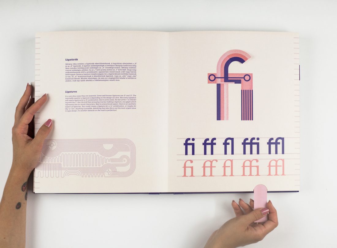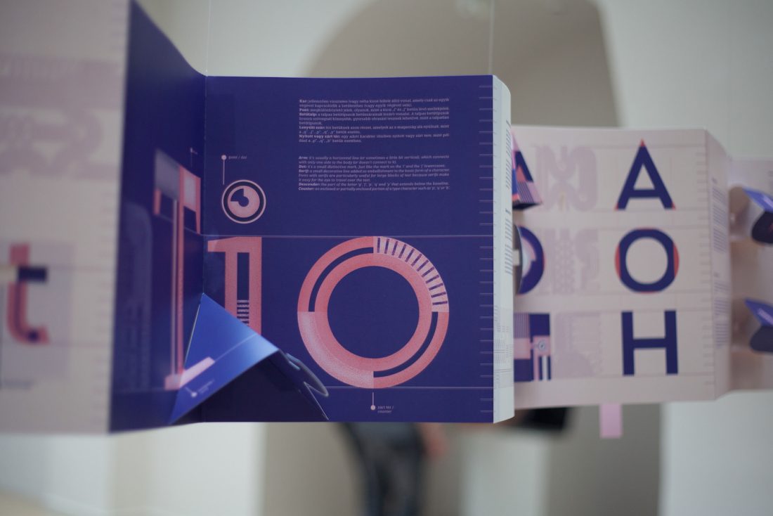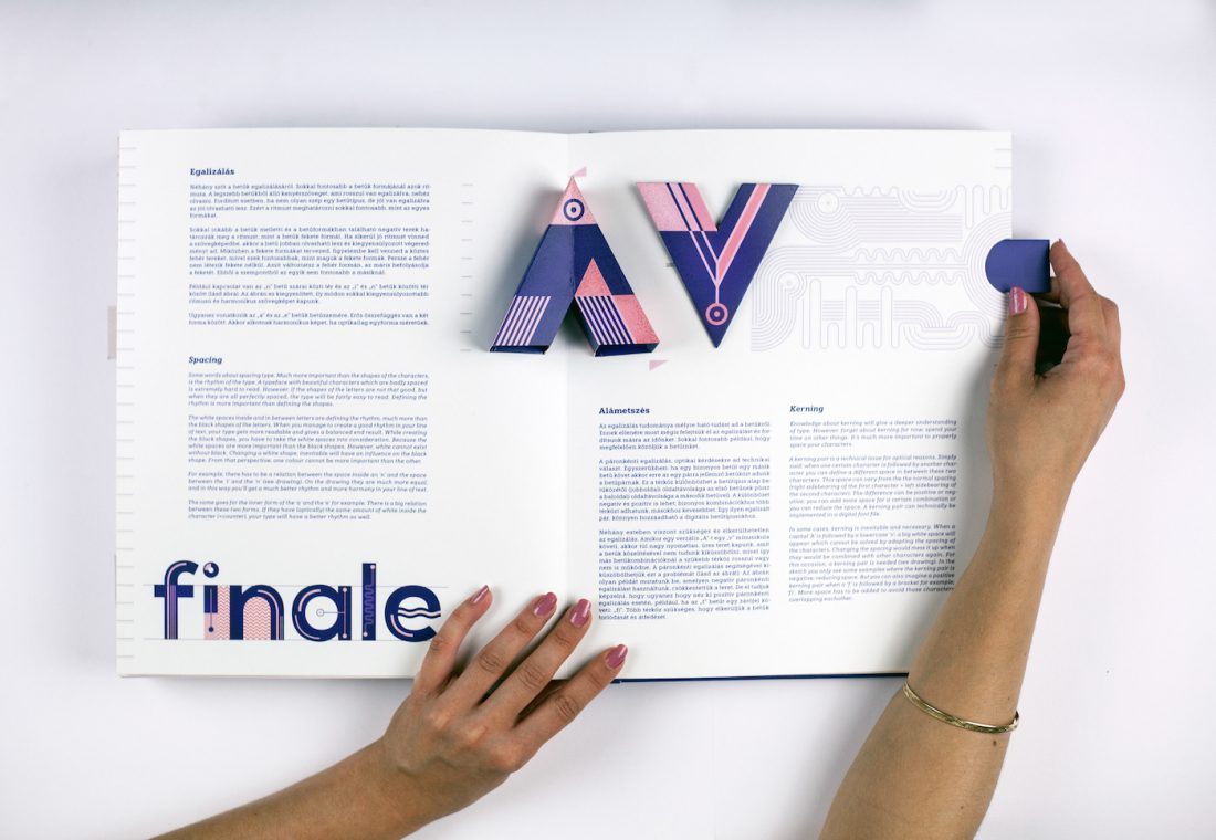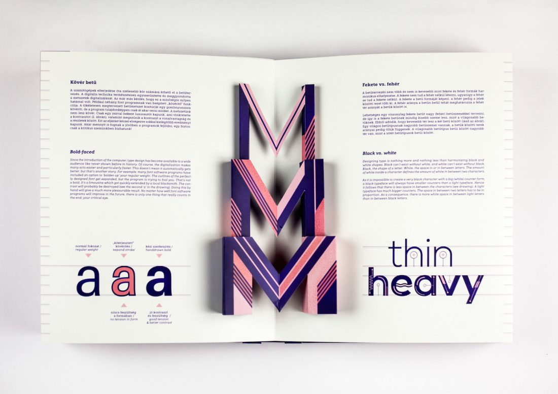 La novità del suo approccio sta però nell’applicazione del metodo pop-up alle regole di base della tipografia. Nel libro infatti Mónika cerca di dare un quadro più ampio possibile dei fondamenti attraverso i quali comprendere la tipografia grazie allo studio dei loro movimenti meccanici, per metterne in luce in modo chiaro il funzionamento. La studentessa approfondisce infatti molteplici aspetti: la terminologia delle lettere, il loro equilibrio ottico, l’origine calligrafica, il bilanciamento degli spazi in bianco e nero, l’equilibrio delle forme, le proporzioni, le legature, l’uso corretto dei trattini, delle virgolette e dei tre punti, l’uso del maiuscolo o minuscolo, del corsivo e altri dettagli tipografici.