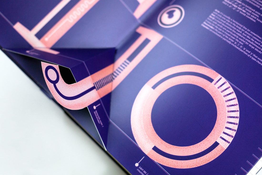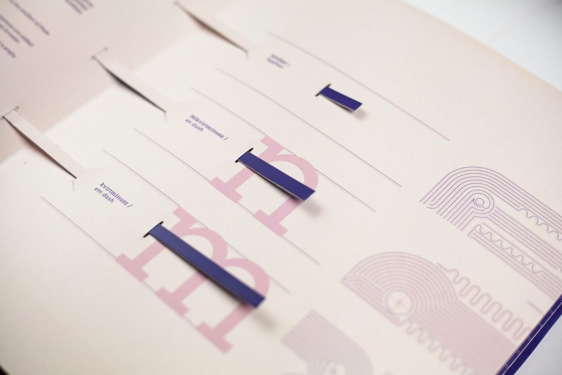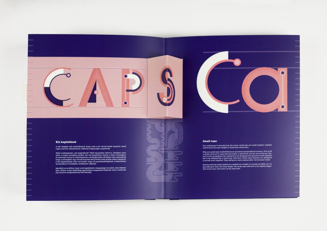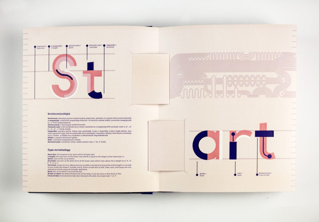 La novità del suo approccio sta però nell’applicazione del metodo pop-up alle regole di base della tipografia. Nel libro infatti Mónika cerca di dare un quadro più ampio possibile dei fondamenti attraverso i quali comprendere la tipografia grazie allo studio dei loro movimenti meccanici, per metterne in luce in modo chiaro il funzionamento. La studentessa approfondisce infatti molteplici aspetti: la terminologia delle lettere, il loro equilibrio ottico, l’origine calligrafica, il bilanciamento degli spazi in bianco e nero, l’equilibrio delle forme, le proporzioni, le legature, l’uso corretto dei trattini, delle virgolette e dei tre punti, l’uso del maiuscolo o minuscolo, del corsivo e altri dettagli tipografici.